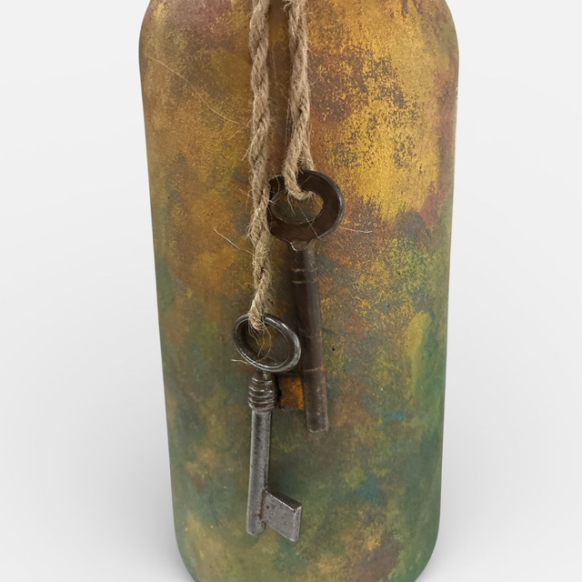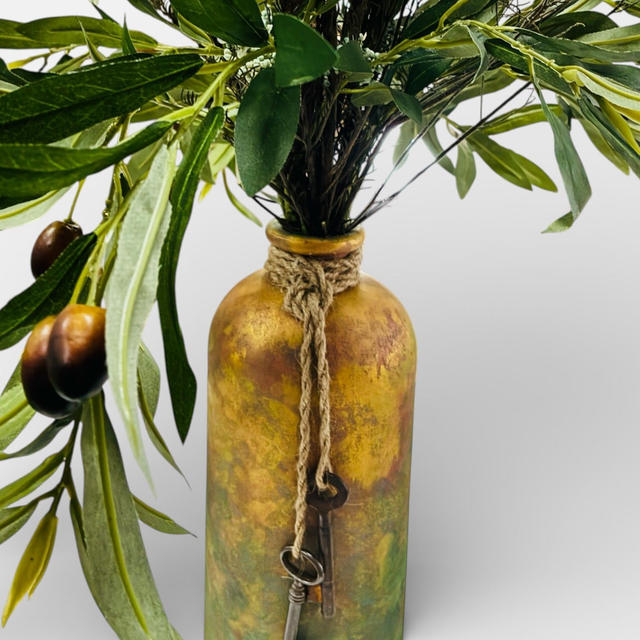 Este exclusivo jarrón ha sido pintado a mano, logrando una textura rica en matices que transitan entre el mostaza cálido y el verde musgo, evocando el paso del tiempo sobre el metal y la piedra. Su carácter único reside en su detalle más preciado: un atado de cuerda rústica que sostiene llaves antiguas verdaderas. No son reproducciones; son piezas de hierro auténticas que alguna vez abrieron puertas reales, añadiendo una capa de historia y nostalgia a tu hogar. Coronado con una selección de follaje silvestre de alta calidad que aporta verticalidad y elegancia, lo que lo convierte en el protagonista ideal para rincones de cocina, islas centrales o recibidores de estilo industrial y vintage.