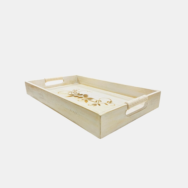 Fabricada en madera y pintada a mano, presenta un suave acabado en beige envejecido que sirve de lienzo para un delicado motivo floral central en tonalidades doradas. El diseño se completa con unos encantadores agarraderos forrados en cuerda color crema, aportando una textura natural y un agarre cómodo.