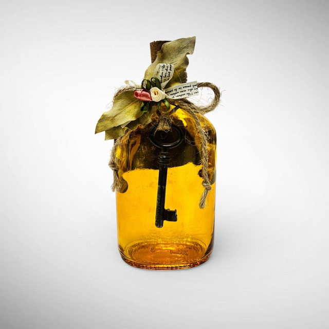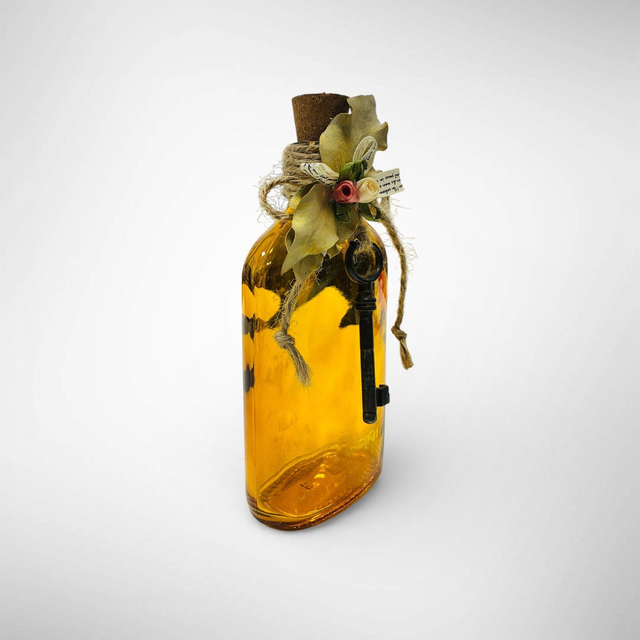 Posee una llave de hierro antigua real que flota suspendida, invitando a imaginar qué puertas abrió en el pasado. El cálido vidrio ámbar está abrazado por cuerdas rústicas de yute, una cinta de tela con caligrafía, hojas secas con un toque dorado y delicadas rosas de tela, creando una estética vintage y cottage irresistible.
