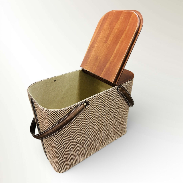 Su estructura robusta se complementa con una tapa rígida de madera maciza en tono oscuro, que no solo protege tus alimentos, sino que funciona como una práctica mesa auxiliar. Cuenta con asas de cuero resistentes que facilitan su transporte y añaden un toque de elegancia rústica.