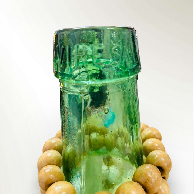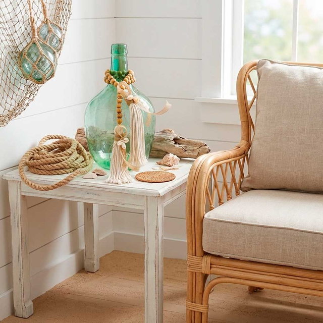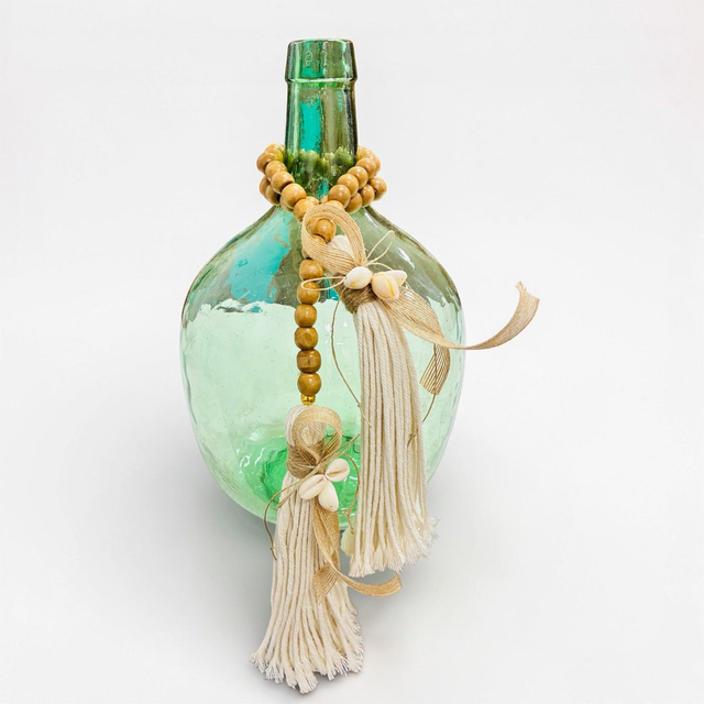 Lo que hace realmente especial a esta pieza es el colgante de diseño exclusivo que la acompaña. Elaborado a mano con cuentas de madera natural, borlas de hilo de algodón y detalles de conchas marinas, este adorno suaviza la robustez del vidrio antiguo y le aporta una estética mediterránea y orgánica.