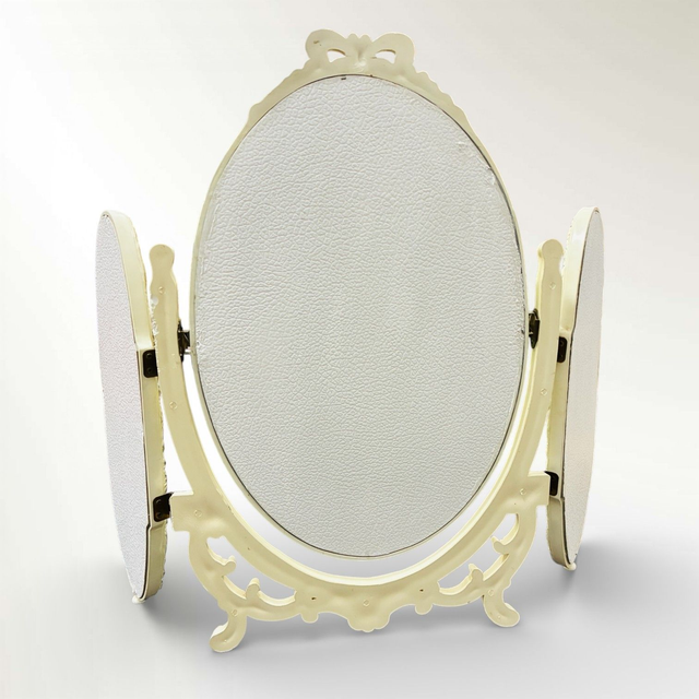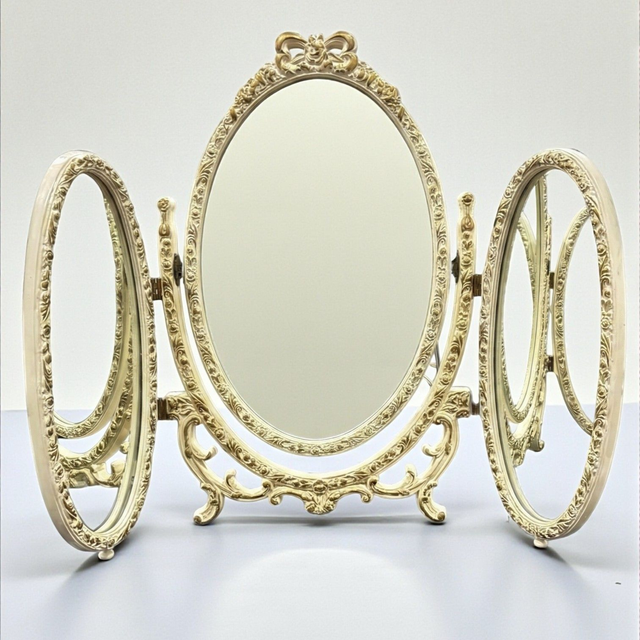 Transforma tu rincón de belleza con este espectacular espejo tríptico de sobremesa, una auténtica joya del pasado. Evocando el esplendor del estilo Francés Rococó (probablemente una pieza de mediados del siglo XX, años 50-60), su marco está profusamente decorado con volutas, motivos vegetales y un elegante lazo en la parte superior.