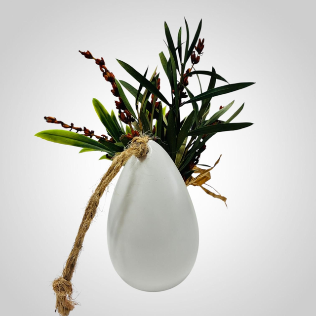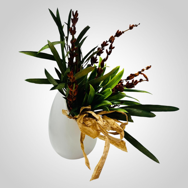 Descubre la grandeza de lo pequeño con Naturae. Este encantador mini arreglo captura la esencia del campo en un formato compacto. Presentado en un delicado jarrón blanco tipo huevo, destaca por su lazo de rafia natural que abraza un bouquet de follaje verde y espigas silvestres en tonos tierra.