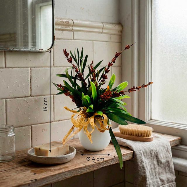 Con una altura total de 15 cm y una base de solo 4 cm, es la solución perfecta para dar vida a rincones olvidados sin ocupar espacio. Ideal para mesitas de noche, estanterías de baño, escritorios o mesas de terraza pequeña. Un "pequeño gran detalle" que aporta calidez instantánea.